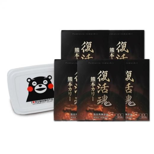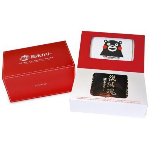 熊本県の牛肉と野菜の旨みをぎゅっと凝縮した『復活魂・熊本カリー』に、くまモンの使いやすいランチボックスがついた専用化粧箱入りギフトセットです。